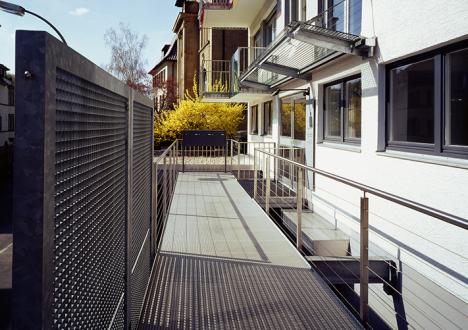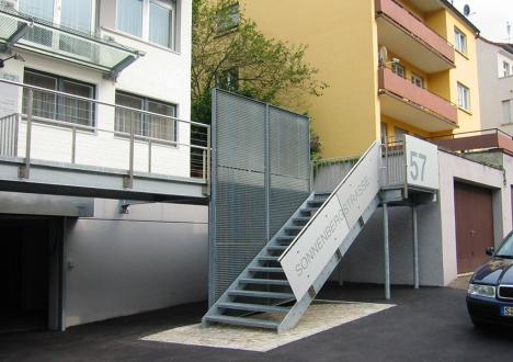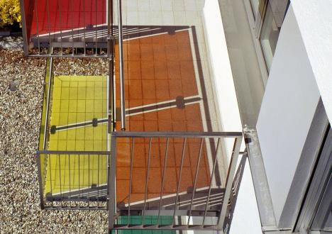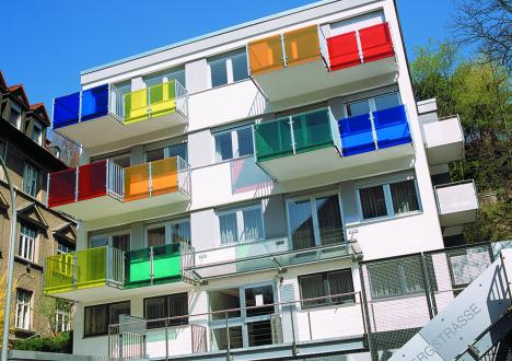 Das in die Jahre gekommene Bürohaus sollte ein zeitgemäßes äußeres Erscheinungsbild erhalten. Hierzu wurde neben notwendigen Sanierungsarbeiten der Eingangsbereich neu gestaltet. Die bunten Glasbalkone in "Bonbonfarben" verleihen dem Haus ein unverwechselbares Erscheinungsbild. Licht- und Schattenspiel lassen die Farben über das ganze Haus fließen – zu jeder Tageszeit anders.